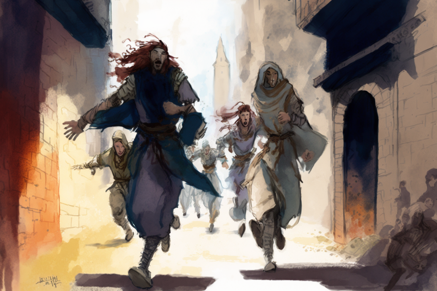 Kukis and Amelin were stricken with terror, but they had no time to grieve. Frantically, they gathered their belongings, desperate to flee the city before it was too late. Abruptly, the doors flew open, and enemy troops burst into the room.